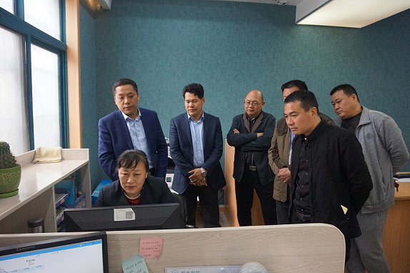 北京海樂達何董、北京建海春食品,四川紫金都市陳、農天薯業張一行在萬杰智能研發中心了解研發流程