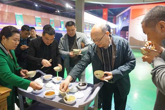 北京海樂達何董、北京建海春食品,四川紫金都市陳、農天薯業張一行體驗智能高端制面制作出的面條