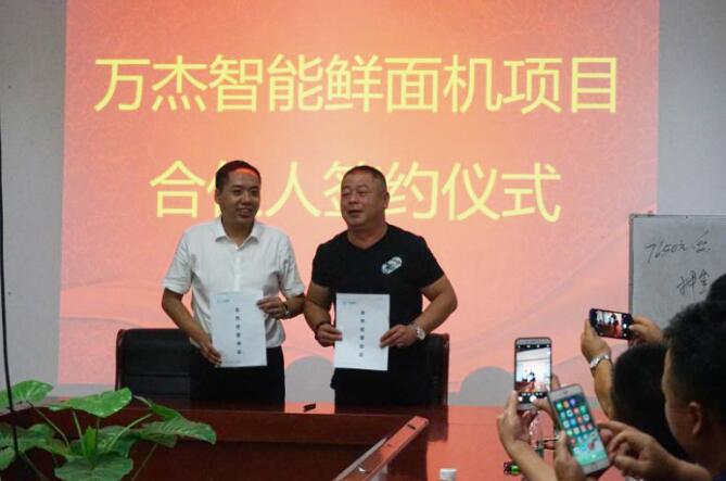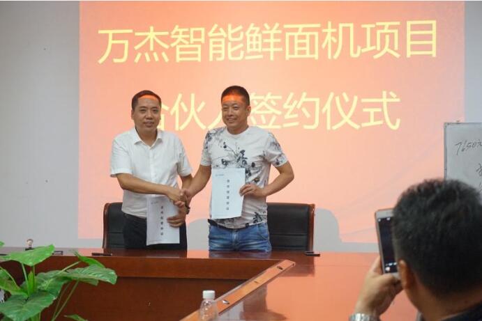 2017年7月17日,萬杰智能總部再次傳來喜訊,鶴壁市海鶴商貿有限公司、河南英仁餐飲管理有限公司與萬杰智能簽訂合作協議,作為在各自領域擁有一定資源和影響力的兩位新晉城市合伙人,在今后的合作中,將攜手萬杰智能,互利共贏,強強聯合,共同致力于智能鮮面機這項造福百姓主食安全的事業。
