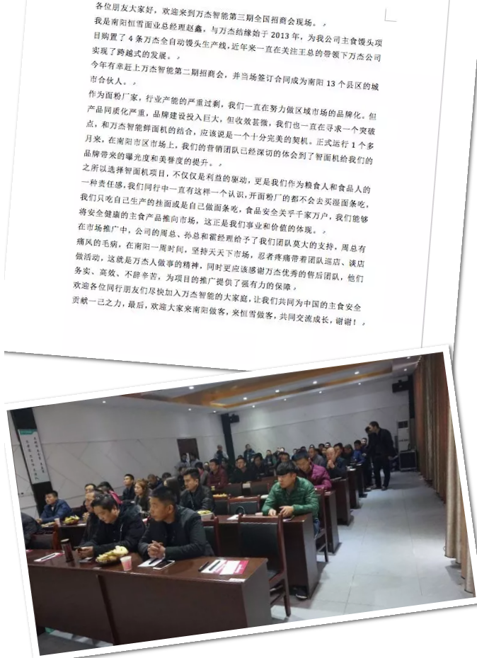 | 2017年12月29日,萬杰智能鮮面機(jī)第三期全國招商會和中型生產(chǎn)線新品發(fā)布會同時(shí)在萬杰智能總部召開。在新的一年即將到來之際,眾多經(jīng)銷商和糧油界的朋友們寄托新的希望,齊聚萬杰展望未來,共謀未來發(fā)展新商機(jī)。 為了讓嘉賓們能夠更加深入的了解萬杰智能,主辦方特地安排嘉賓在招商會當(dāng)天上午參觀萬杰智能工廠,從生產(chǎn)制造中心、研發(fā)中心、產(chǎn)品展示廳到遠(yuǎn)程控制中心,使嘉賓們充分了解萬杰智能的研發(fā)能力和制造實(shí)力,深切感受到萬杰智能20年的積累。 經(jīng)過午餐和簡單的茶歇,嘉賓們齊聚萬杰招商會現(xiàn)場,萬杰智能第三期全國招商大會正式開始。會上,首先由北京先行曾鵬飛為意向合伙人做萬杰智能鮮面機(jī)的項(xiàng)目介紹;然后由萬杰智能科技股份有限公司王曉杰董事長做“傳統(tǒng)還在,未來已來”主題報(bào)告;最后由來自南陽和新鄉(xiāng)的城市合伙人為意向合伙人分享市場心得和運(yùn)營經(jīng)驗(yàn),涵蓋了從終端洽談、現(xiàn)場陳列、消費(fèi)者溝通等眾多細(xì)節(jié),內(nèi)容豐富全面,引來現(xiàn)場不少嘉賓的共鳴。 由于萬杰智能鮮面機(jī)擁有出色的產(chǎn)品力和科學(xué)的商業(yè)模式,現(xiàn)場不少嘉賓都對萬杰智能鮮面機(jī)項(xiàng)目產(chǎn)生了濃厚的興趣。目前,萬杰智能的相關(guān)工作人員正在和有合作意向的嘉賓就合作細(xì)節(jié),進(jìn)行深度的商談接洽。 本次招商會的順利召開,為中國的傳統(tǒng)制造行業(yè)注入了一股新的活力。未來,萬杰智能將繼續(xù)堅(jiān)持科技智能創(chuàng)新,為中國的老百姓創(chuàng)造更多更好的智能主食機(jī)械,為中國億萬家庭的主食安全保駕護(hù)航。 招商會花絮 |