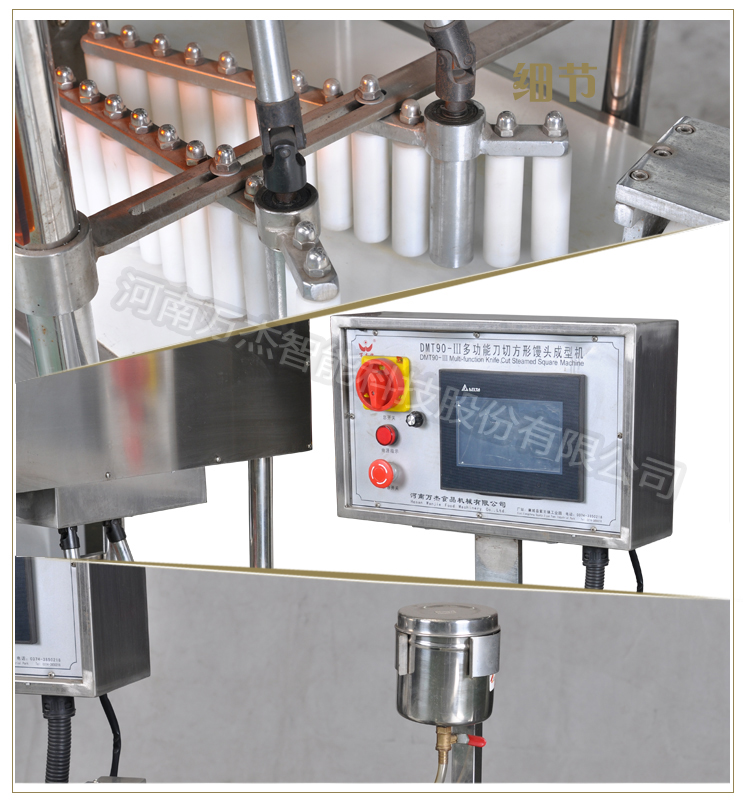 DMT90-Ⅲ觸摸屏微電腦控制方饅頭生產線,整個機組配備有SIKE光電、進口變頻調速電機,PLC數控觸摸屏操作,與食品接觸部分采用優質不銹鋼,確保生產運行平穩、可靠、衛生。